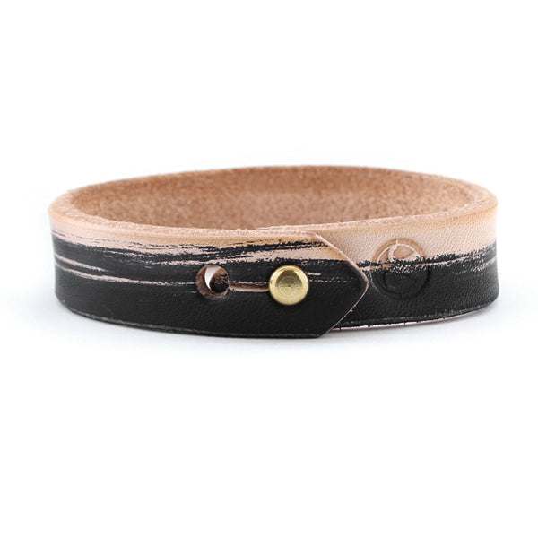 This classic leather bracelet is made from rich and durable vegetable tanned English bridle leather and was designed to be worn as an accent piece for casual or semi-formal dress. It is approximately 5/8 inch wide, and features a single solid brass stud with two size holes for the perfect fit. It will develop a unique patina over time and can be worn by itself or paired with others for a a truly personalized look.